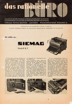 Artikel/Prospekt für Büroschreibmaschine Siemag II T in: Das rationelle Büro (Sonderdruck), 3/1952, S. 95 Autor: Peter Basten