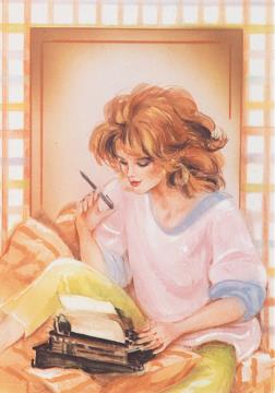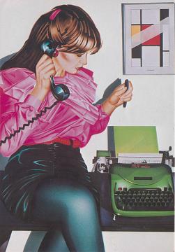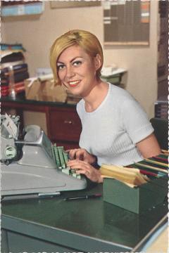 Illustrierte Postkarte; Fotografie, koloriert Rückseite: Frau mit Schreibmaschine, Blick zum Betrachter Vorderseite nicht beschrieben