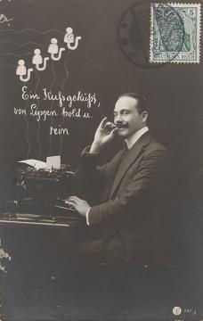 Illustrierte Postkarte; Fotografie, bearbeitet, monochrom; Serie 101/3 Rückseite: Mann mit Schreibmaschine, ins Bild eingefügte Keramikisolatoren und Stromkabel; Briefmarke Deutsches Reich 5 Pf.; Poststempel 21.12.1907 Vorderseite: beschrieben und adressiert; Poststempel Flörchingen/22.12.1907