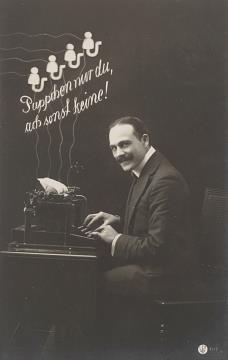 Illustrierte Postkarte; Fotografie, Grafik, koloriert; Serie ABC 2540 Rückseite: Mann/Sekretär mit Schreibmaschine; dekorativer Rahmen, Kartusche mit Gedicht Vorderseite: beschrieben und adressiert; Poststempel 1933