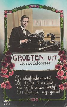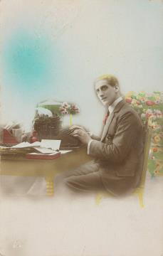 Illustrierte Postkarte; Fotografie, koloriert; Serie M 294 Rückseite: Mann mit Schreibmaschine, Blumen als Dekoration Vorderseite beschrieben