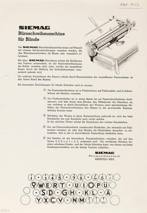 Prospekt für Büroschreibmaschine Siemag mit Sondereinrichtung zur erleichterten Bedienung für Blinde Datum handschriftlich vermerkt