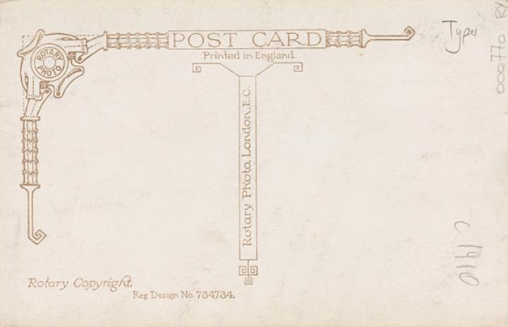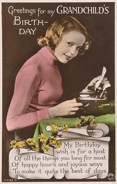 Illustrierte Postkarte; Fotografie, Grafik, polychrom; Rotary Photo Nr. T.R. 23-31 Rückseite: Mädchen mit Schreibmaschine, Kartusche mit Glückwunschtext in Versform Vorderseite nicht beschrieben