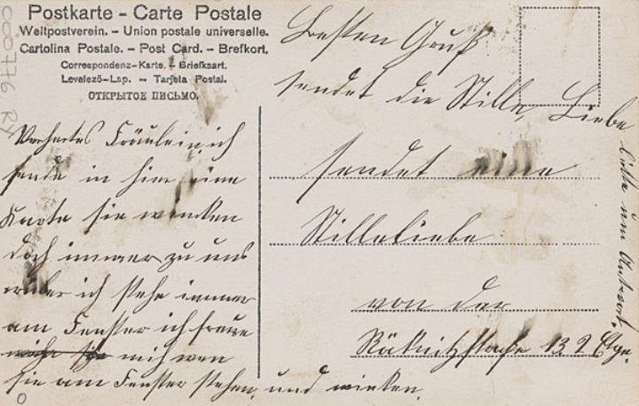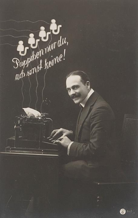 Illustrierte Postkarte; Fotografie, bearbeitet, monochrom; Serie 101/4 Rückseite: Mann mit Schreibmaschine, Blick zum Betrachter, ins Bild eingefügte Keramikisolatoren und Stromkabel Vorderseite beschrieben
