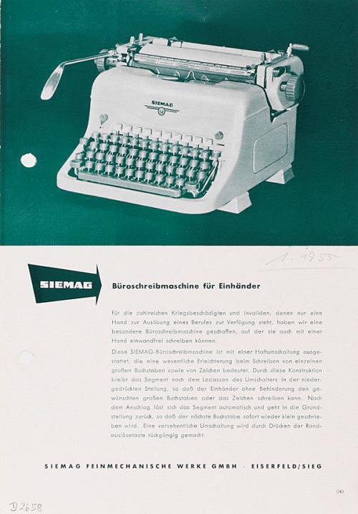 Prospekt für Schreibmaschine Siemag mit Haftumschaltung Nr. 040 Datum handschriftlich vermerkt