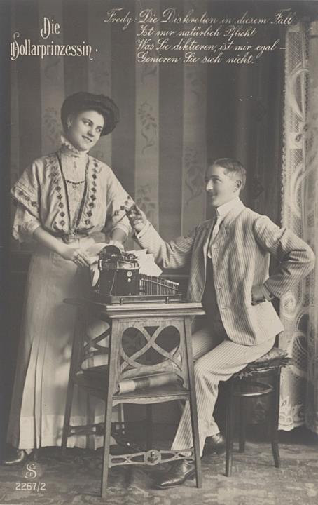 Illustrierte Postkarte; Fotografie, monochrom; Serie 2267/2 Rückseite: gestelltes Szenenfoto aus der Operette "Die Dollarprinzessin"; Schauspielerin und Schauspieler mit Schreibmaschine, oben rechts Textzeile aus dem Stück: Die Diskretion in diesem Fall [...] Vorderseite nicht beschrieben