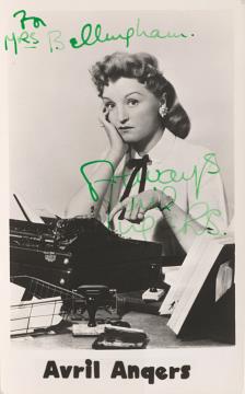 Illustrierte Postkarte mit Autogramm; Fotografie, monochrom Rückseite: Schauspielerin Avril Angers mit Schreibmaschine Vorderseite nicht beschrieben