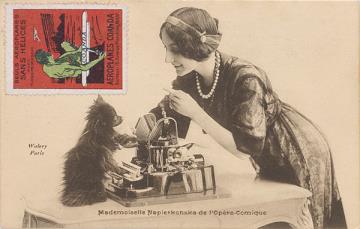 Illustrierte Postkarte; Fotografie, monochrom; Fotograf: Walery Paris Rückseite: Schauspielerin Stacia Napierkowska mit Hund und Schreibmaschine Oliver; aufgeklebte Werbemarke "Aeroplanes Coanda" Vorderseite: beschrieben, adressiert; Briefmarke Postes Francaises 10c; Poststempel unleserlich