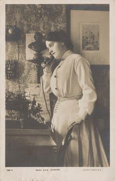 Illustrierte Postkarte; Fotografie, monochrom; Rotary Photo Nr. 199 V Rückseite: Schauspielerin Evie Greene mit Schreibmaschine und Telefon Vorderseite: beschrieben, adressiert; Briefmarke Postage Revenue (U.K.) Half Penny; Poststempel London/May 13 xx