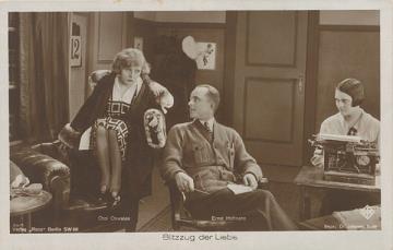 Illustrierte Postkarte; Fotografie, monochrom; Nr. 30/7 Rückseite: Standfoto aus dem Film "Blitzzug der Liebe" (1925); Schauspieler Ossi Oswalda und Ernst Hofmann, weitere Schauspielerin mit Schreibmaschine Vorderseite nicht beschrieben