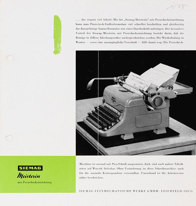 Faltprospekt für Schreibmaschine Siemag Meisterin mit Postscheckeinrichtung Nr. 038/3V