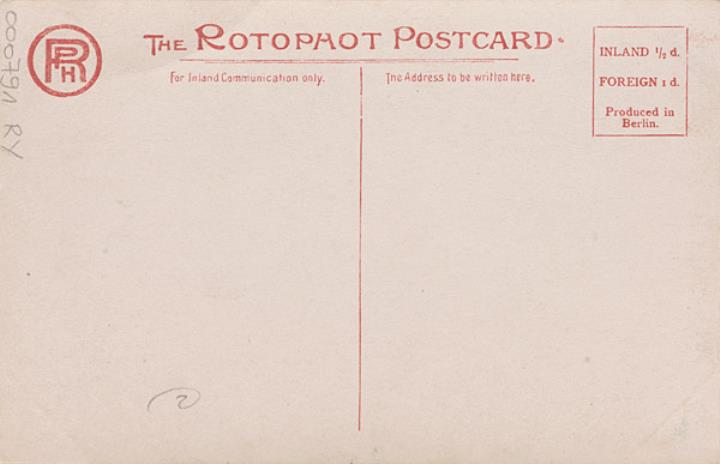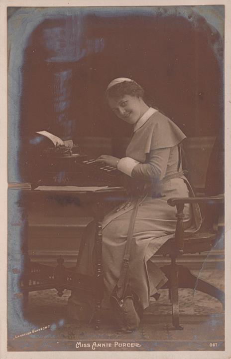 Illustrierte Postkarte; Fotografie, monochrom; Nr. 67, Foto: Langfier Glasgow Rückseite: Rollenporträt; Schauspielerin Annie Purcell mit Schreibmaschine Yost Vorderseite nicht beschrieben