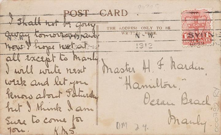 Illustrierte Postkarte; Fotografie, koloriert Rückseite: Rollenporträt; Schauspielerin Edna May mit Schreibmaschine Yost Vorderseite: beschrieben, adressiert; Briefmarke New South Wales 1d; Poststempel NSW/Mr 23 1912