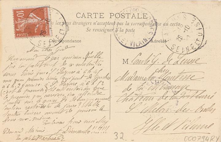 Illustrierte Postkarte; Fotografie, monochrom; Fotograf: Walery Paris Rückseite: Schauspielerin Stacia Napierkowska mit Hund und Schreibmaschine Oliver; aufgeklebte Werbemarke "Aeroplanes Coanda" Vorderseite: beschrieben, adressiert; Briefmarke Postes Francaises 10c; Poststempel unleserlich