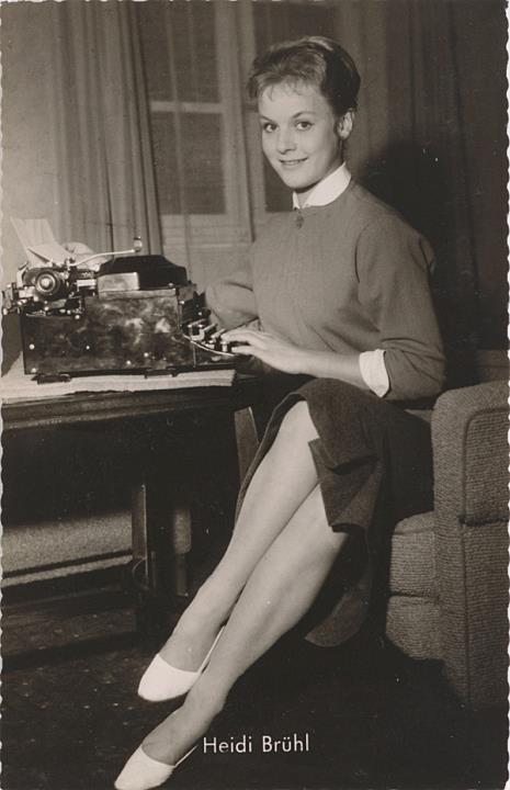 Illustrierte Postkarte; Fotografie, monochrom Rückseite: Schauspielerin Heidi Brühl mit Schreibmaschine Vorderseite nicht beschrieben