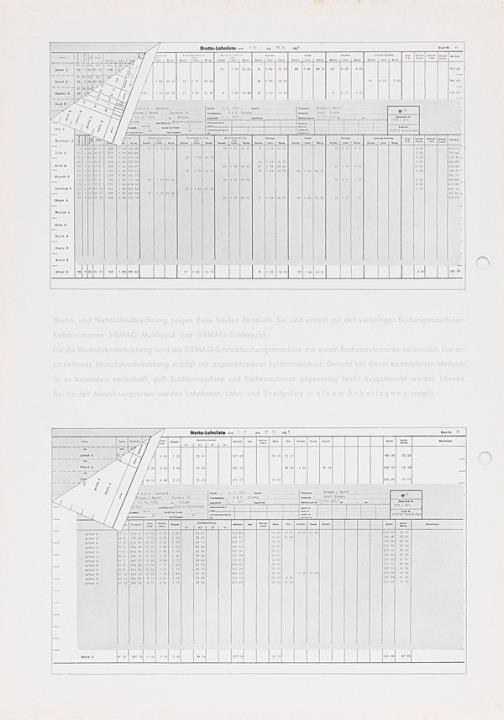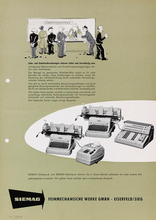 Prospekt für Schreib- und Fakturiermaschinen Siemag Saldoquick und Multiquick Lohn- und Gehaltsabrechnungen müssen sicher und zuverlässig sein Nr. 058