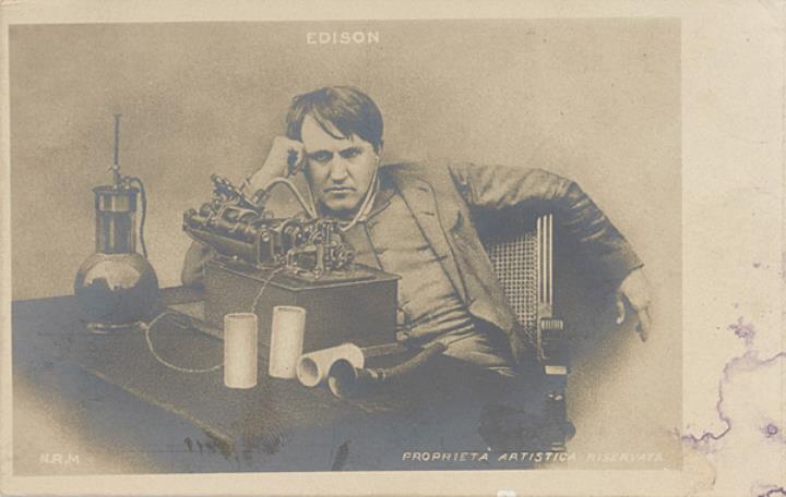 Illustrierte Postkarte; Fotografie, monochrom; N.R.M. Rückseite: Erfinder Thomas Edison mit Phonographen Vorderseite nicht beschrieben