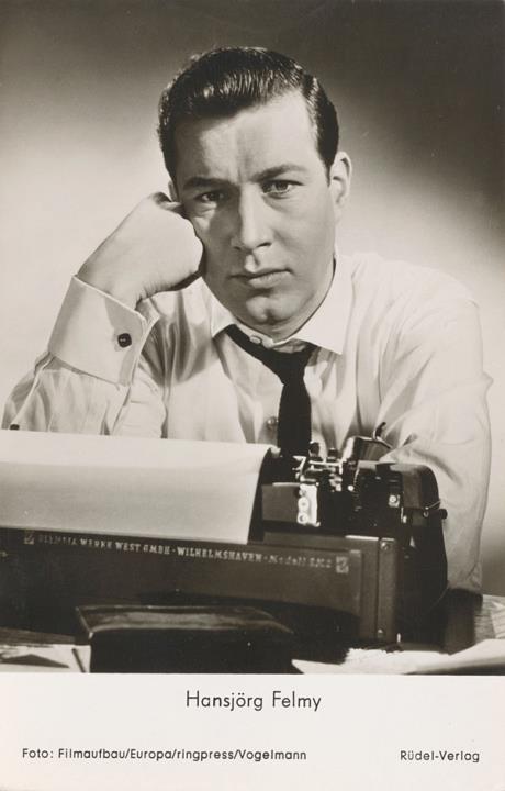 Illustrierte Postkarte; Fotografie, monochrom; Rüdel Verlag Nr. 2660 Rückseite: Schauspieler Hansjörg Felmy mit Schreibmaschine (Film "Der Mann, der sich verkaufte") Vorderseite nicht beschrieben