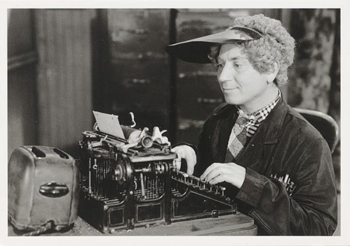 Illustrierte Postkarte; Fotografie, monochrom Rückseite: Schauspieler Harpo Marx mit Augenschirm, Schreibmaschine und Toaster Vorderseite nicht beschrieben