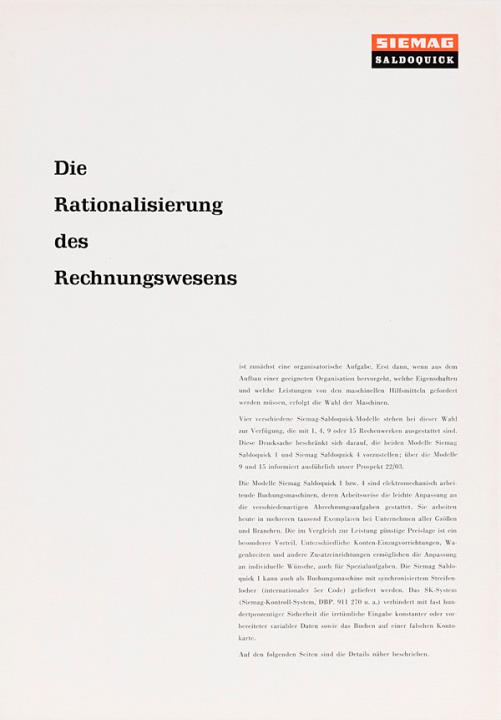 Faltprospekt in zweifacher Ausführung für Schreib- und Buchungsmaschine Siemag Saldoquick Nr. 22/08 9.60/Vo.