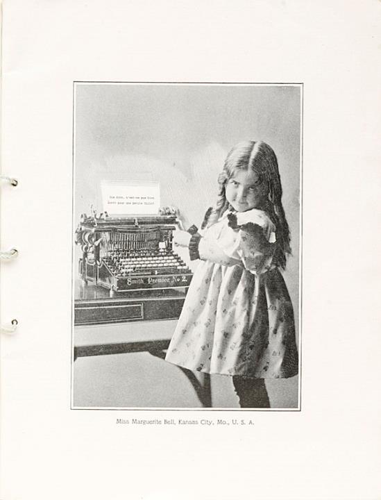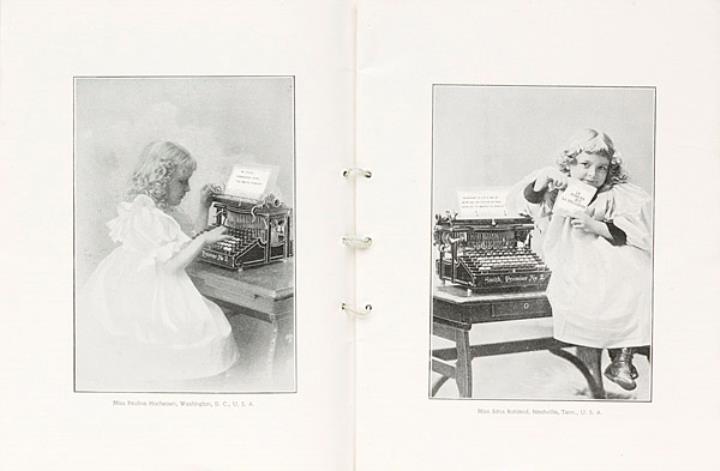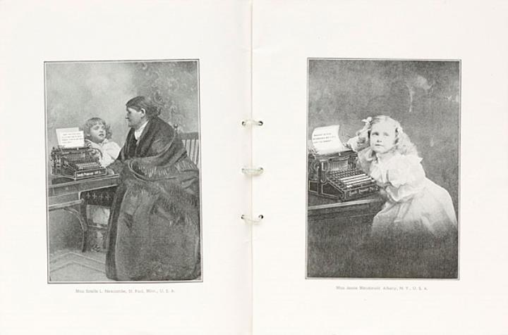 Prospekt für Schreibmaschine Smith Premier mit Werbeaufnahmen von Kindern mit Schreibmaschine angebrachter Stempel "Exposition Universelle de 1900 Grand Prix"
