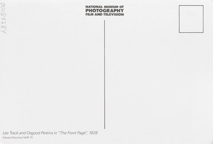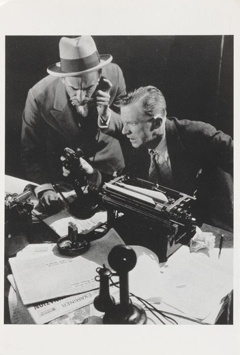 Illustrierte Postkarte; Fotografie, monochrom Rückseite: gestelltes Szenenfoto aus dem Bühnenstück "The Front Page" (1928); Schauspieler Lee Track und Osgood Perkins mit Telefon und Schreibmaschine