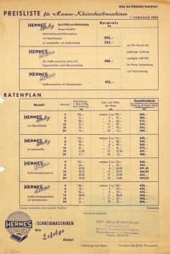 Preisliste und Ratenplan für Klein- und Großschreibmaschinen Hermes Stand: 1. Februar 1955