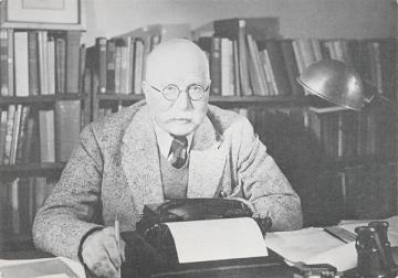 Illustrierte Postkarte; Fotografie, monochrom Rückseite: Mann in einem Arbeitszimmer; Tisch mit Schreibmaschine und Büchern (Maine 1201-1850), im Hintergrund vier Kettentaschen Vorderseite nicht beschrieben