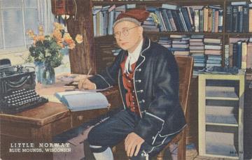 Illustrierte Postkarte; Fotografie, polychrom Rückseite: Mann in Tracht an einem Tisch mit Schreibmaschine sitzend Vorderseite: beschrieben; adressiert an Mr.+Mrs. Clunie, Racine; Briefmarke U.S. Postage 1 Cent; Poststempel Mount Horeb/Jul 29 1950
