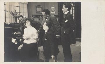 Illustrierte Postkarte; Fotografie, monochrom Rückseite: Standfoto aus einem Film; Sekretärin mit Schreibmaschine, umworben von vier Männern Vorderseite nicht beschrieben