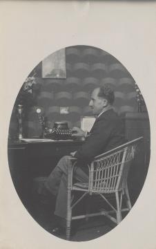 Illustrierte Postkarte; Fotografie, monochrom; Foto: Douglas Glass Rückseite: Schriftsteller Arthur Ransome mit Schreibmaschine Vorderseite nicht beschrieben