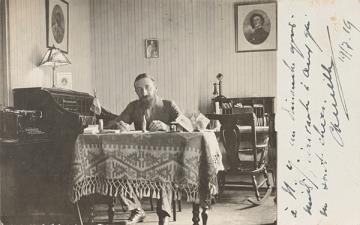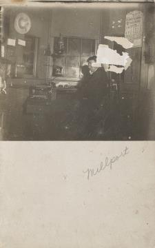 Illustrierte Postkarte; Fotografie, monochrom Rückseite: Mann in einem Schreibzimmer mit Telefon, Tischflagge (Frankreich?) und Schreibmaschine; Leerraum beschrieben, datiert 19/7.1919 Vorderseite nicht beschrieben