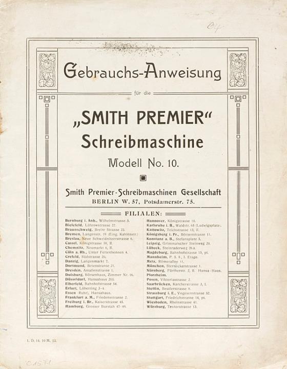 Gebrauchs-Anweisung für die Smith Premier Schreibmaschine Modell No. 10