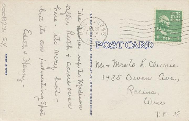 Illustrierte Postkarte; Fotografie, polychrom Rückseite: Mann in Tracht an einem Tisch mit Schreibmaschine sitzend Vorderseite: beschrieben; adressiert an Mr.+Mrs. Clunie, Racine; Briefmarke U.S. Postage 1 Cent; Poststempel Mount Horeb/Jul 29 1950