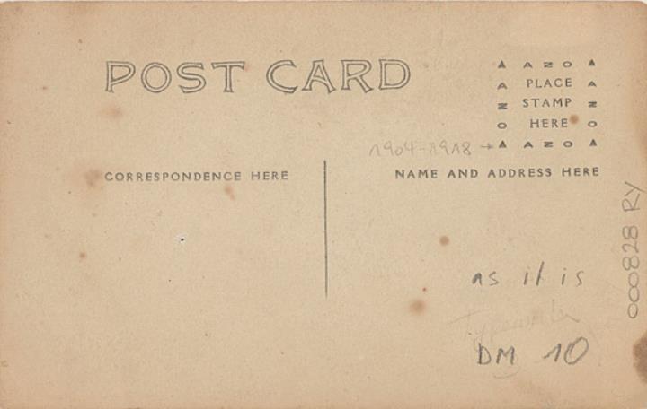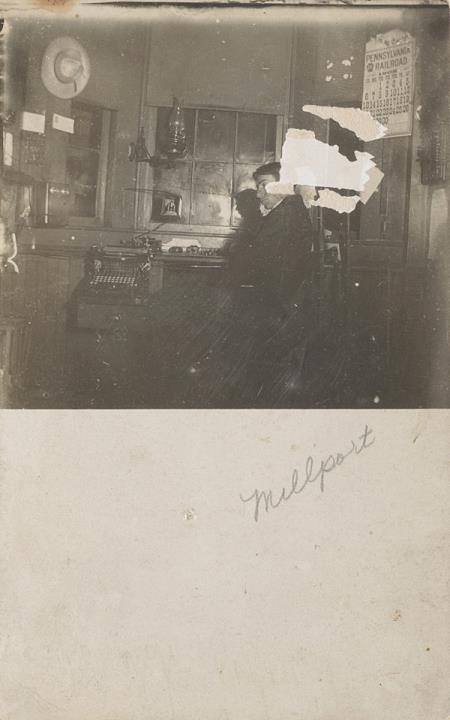 Illustrierte Postkarte; Fotografie, monochrom, beschädigt Rückseite: Mann (Seitenporträt) in einem Schreibzimmer mit Schreibmaschine, Wandkalender der Pennsylvania Railroad 1908; Leerraum beschrieben (Millport) Vorderseite nicht beschrieben