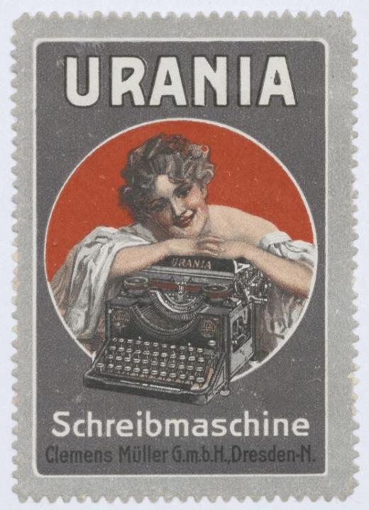 Reklamemarke/Werbemarke für Schreibmaschine Urania; rechteckig, polychrom Text: Clemens Müller G.m.b.H. Dresden-N.