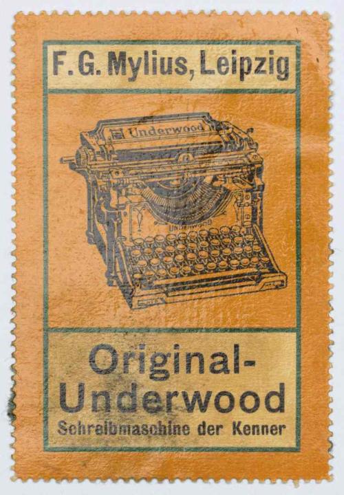 Reklamemarke/Werbemarke für Schreibmaschine Underwood; rechteckig, polychrom Text: F.G. Mylius, Leipzig