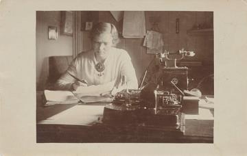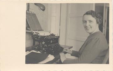 Illustrierte Postkarte; Fotografie, monochrom Rückseite: Frau mit Schreibmaschine in einem Zimmer, im Hintergrund eine Waschecke Vorderseite nicht beschrieben