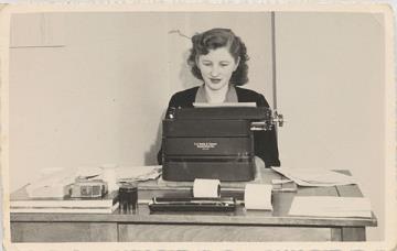 Illustrierte Postkarte; Fotografie, monochrom Rückseite: Sekretärin mit Schreibmaschine in einem Büro, im Hintergrund Telefonapparat Vorderseite nicht beschrieben