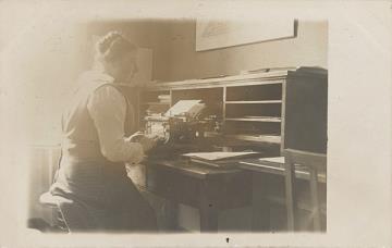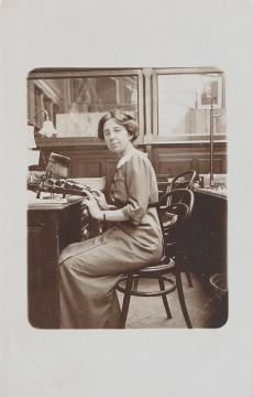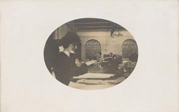 Illustrierte Postkarte; Fotografie, monochrom Rückseite: Sekretärin mit Schreibmaschine in einem Büro Vorderseite: beschrieben; adressiert (Feldpostkarte); Poststempel Hamburg/31.8.1916