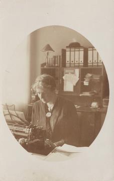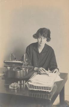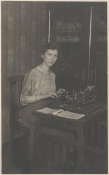 Illustrierte Postkarte; Fotografie, monochrom Rückseite: Frau mit Schreibmaschine (Adler?) in einem Zimmer Vorderseite mit handschriftlichem Vermerk: Dez 1921