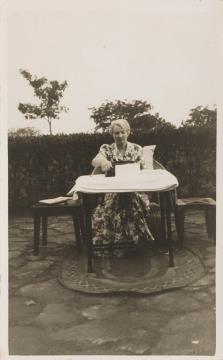 Illustrierte Postkarte; Fotografie, monochrom Rückseite: Frau mit Schreibmaschine an einem Tisch im Freien sitzend Vorderseite nicht beschrieben