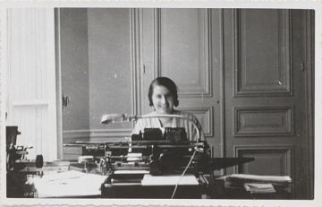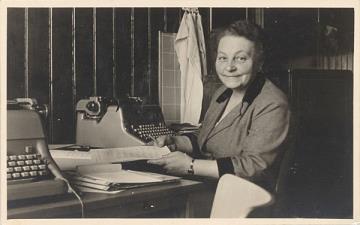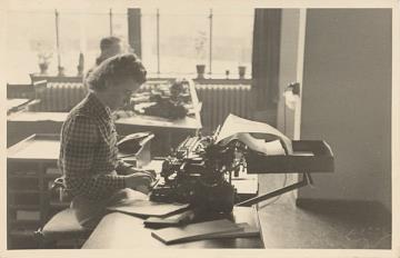 Illustrierte Postkarte; Fotografie, monochrom Rückseite: Sekretärin mit Schreibmaschine (Fernschreiber?) in einem Büro Vorderseite: beschrieben, adressiert; Briefmarke Nederland 2 Cent; Poststempel x7.IV.1956