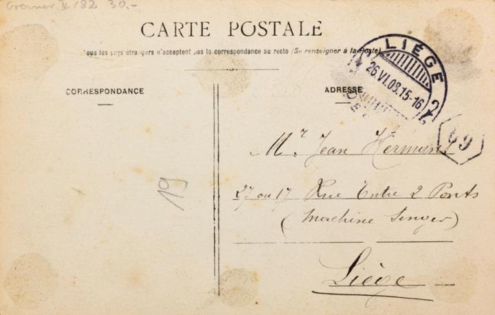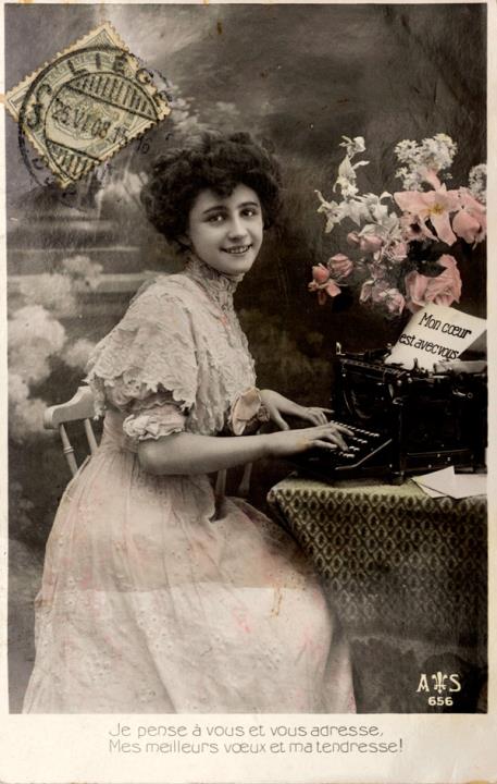 Illustrierte Postkarte; Fotografie, koloriert; Serie AS 656 Rückseite: junge Frau mit Schreibmaschine, Blick zum Betrachter, Blumen als Dekoration, darunter Text in Versform Briefmarke Postes Belgique 1c; Poststempel Liege/25 VI 1908 Vorderseite: adressiert an Mr. Hermans, Liege