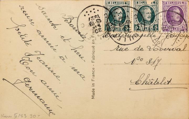 Illustrierte Postkarte; Fotografie, koloriert; Serie Leo 915; Rückseite: Frau mit Schreibmaschine, Blick zum Betrachter Vorderseite: beschrieben und adressiert; Briefmarke Postes Belgique 5c+5c+25c; Poststempel Couillet/30 XII 1927