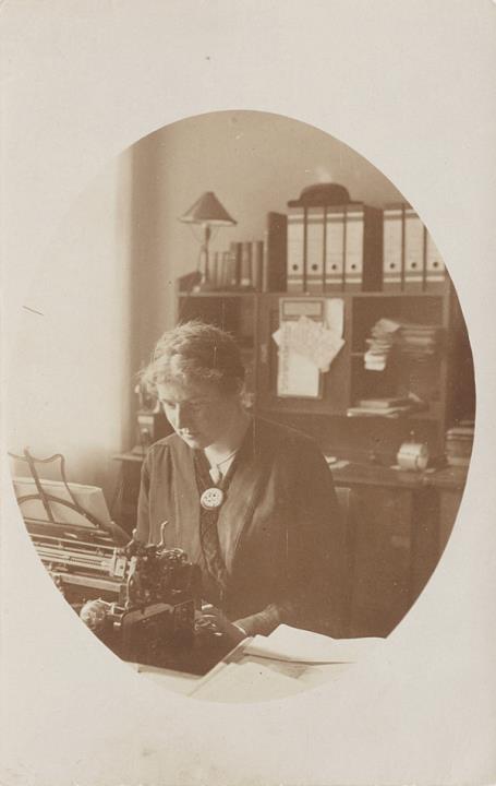 Illustrierte Postkarte; Fotografie, monochrom Rückseite: Sekretärin mit Schreibmaschine in einem Büro Vorderseite: beschrieben, datiert 26.03.1918