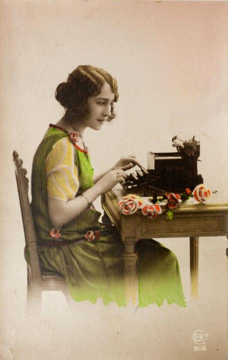 Illustrierte Postkarte; Fotografie, koloriert; Serie Ceko 916 Rückseite: Frau mit Schreibmaschine Vorderseite nicht beschrieben