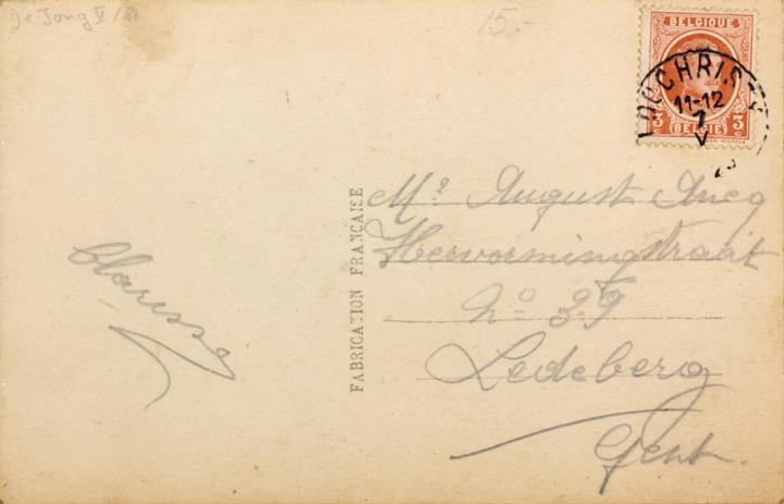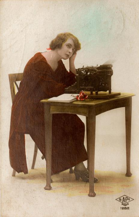 Illustrierte Postkarte; Fotografie, koloriert; Serie Sapi Paris 1282; Rückseite: Frau mit Schreibmaschine Vorderseite: beschrieben und adressiert; Briefmarke Postes Belgique 3c; Poststempel unleserlich
