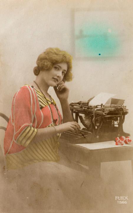 Illustrierte Postkarte; Fotografie, koloriert; Serie Rex 1566; Rückseite: Frau mit Schreibmaschine Vorderseite beschrieben