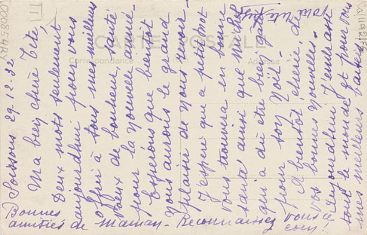 Illustrierte Postkarte; Fotografie, monochrom Rückseite: Frau/Sekretärin in einem Büro mit Telefonzentrale/Vermittlungsstelle Vorderseite: beschrieben; datiert 29.12.1932